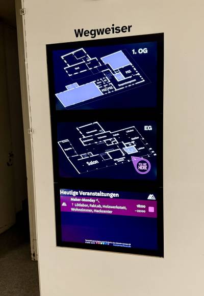 Hinter den Screens selber ist ein Fujitsu-Minirechner verbaut, der im Wifi hängt (wegzeiger.iot.fiber.garden) und eine HDMI-Matrix, die eine 1×4-Aufteilung vornimmt und auf die drei Screens verteilt. Nur der Touchcontroller des untersten Screens ist angeschlossen.